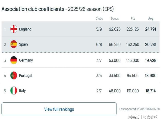 大家比较关心的欧洲联赛排名,根据欧足联公布的最新积分榜,英超在欧冠表现不佳,剩下两个杯赛还不错,领先优势从5分,只是缩小到4.5分。西甲6队在16强全部晋级,已经反超德甲,并且拉开了将近0.8分的差距。葡超3队同样在16强全部晋级,超越了意甲,上升到第四名,只能说,亚平宁足球真的没落了,意大利国家队下周参加附加赛,会不会连续三届无缘世界杯呢?
